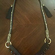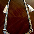 The halter piece is made with the same cable as any cable show halter. Gold with silver accent tones with coral and turquoise accents. The nose band is is a brass shark tooth chain with a captive chin chain.