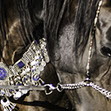 The halter piece is made with the same cable as any cable show halter. Silver and gold tones accented with hand made pieces made of Lapis and purple stones and a silver shark tooth nose band with captive chin chain.